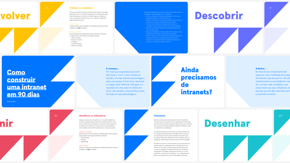 Constituindo-se como mais um contributo para este tema, o “Guia prático como construir uma intranet em 90 dias” está estruturado em 4 fases diferentes. Cada uma destas fases é consubstanciada em 19 etapas que procuram ao longo de todos estes momentos, dotar as equipas de ferramentas práticas. Porventura, a abordagem descrita neste guia, não será a única possível, aliás, não o será com certeza. Apesar disso, este guia representa sim uma sequência de momentos, pensados do princípio ao fim, tendo em vista o envolvimento sincero dos colaboradores neste processo de experimentação e construção.
